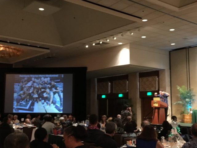 But what there wasn’t, was a robust crowd. It felt like half of the showing of the NCAA Tournament season of 2015-16, Ganot’s first year. UH went to a smaller pocket of the Coral Ballroom than usual, reflecting the crowd of 248. What to make of this? For one thing, banquet seats don’t come cheap anymore, at $150 each, and there are now, as mentioned above, both preseason and postseason events for fans to commit time and money to. For another, it could be attributed to the level of interest based on recent results — it was another middle-of-the-pack Big West season for UH (17-13 overall, 8-8 BWC), one that saw some disappointing crowds at the Stan Sheriff Center as well. And who knows, perhaps the recent San Diego headlines (dismissed by Ganot) affected it as well.