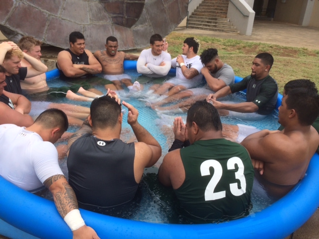 Two more weeks of practice then game prep week prior to UW. Nineteen days or so….lets get this thing moving in the right direction….just FYI for anyone who cares, just had my annual Golf outing “funraiser” 60 guys in all including 4 former players from the early 70’s…..raised over 1000.00 for Na Koa and some checks are still on the way…..raffle prizes were all Warrior branded and surprisingly the most coveted item was the “Rainbow Warrior” vintage shirt with the Menehune on it….guys wanted that more than an UA polo……its good to be a Warrior!!!!